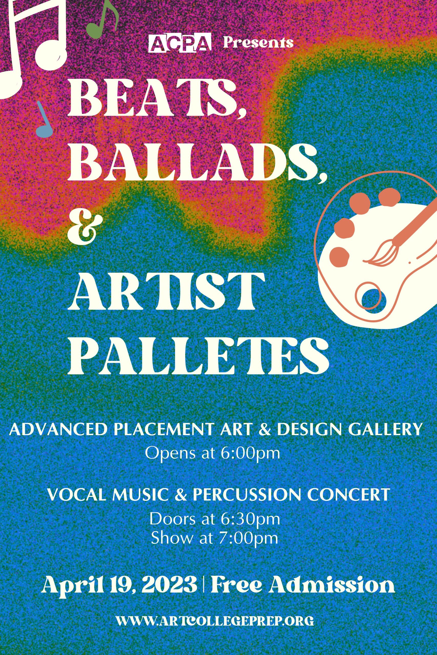 Beats, Ballads, & Artist Palletes on April 19th is a combination of Advanced Placement Art & Design's final gallery, as well as live performances from ACPA's vocal music and percussion groups such as Notable Connections and SpecDrum!