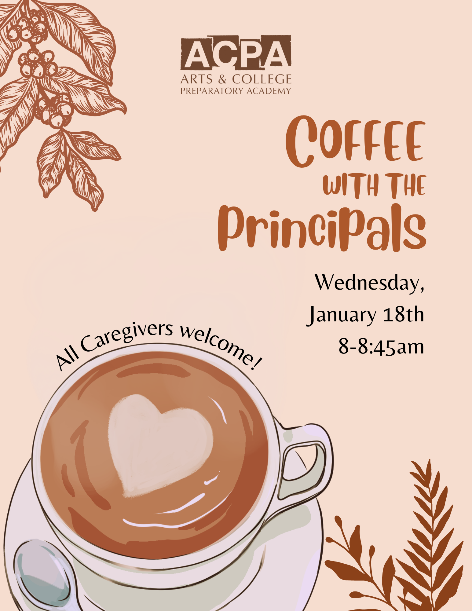 Join Mr. Wagner, Mrs. Bostelman and Mrs. McMillin for coffee and pastries on Wednesday, January 18th from 8-8:45am. All Caregivers are welcome to stop by, ask questions, and chat. We'll see you there!