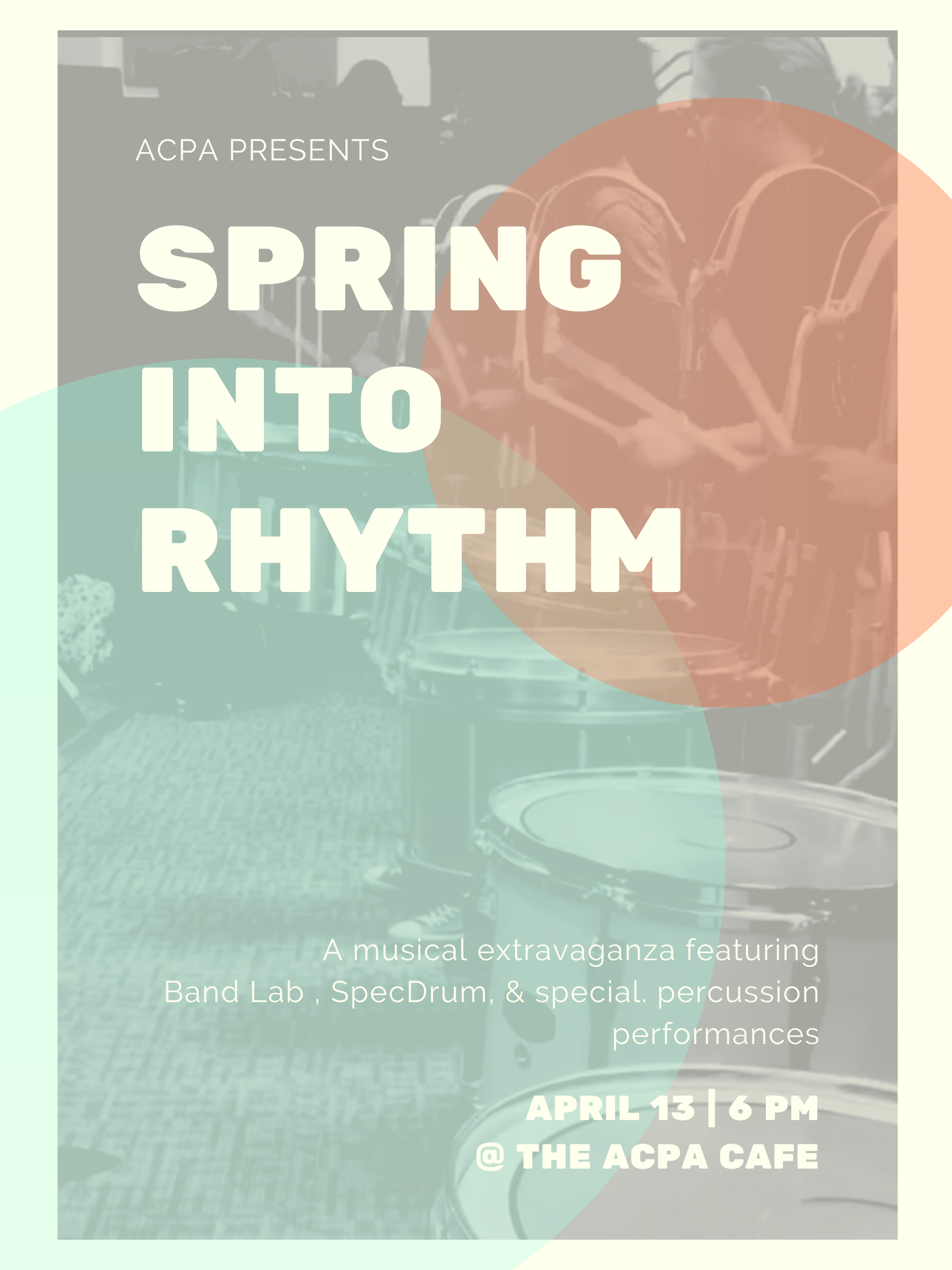 ACPA is proud to present: Spring Into Rhythm on April 13th at 6pm. Please come and see this super fantastical musical extravaganza featuring Band Lab, SpecDrum, and Percussion Ensemble, including a grand finale by senior percussionists! This is free and open to the ACPA Community.