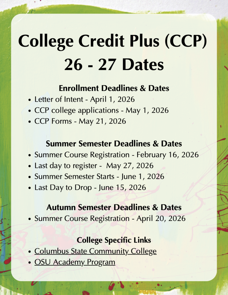 For further information please visit Ohio Department of Education's website for College Credit Plus: https://highered.ohio.gov/initiatives/access-acceleration/college-credit-plus/ccp-home